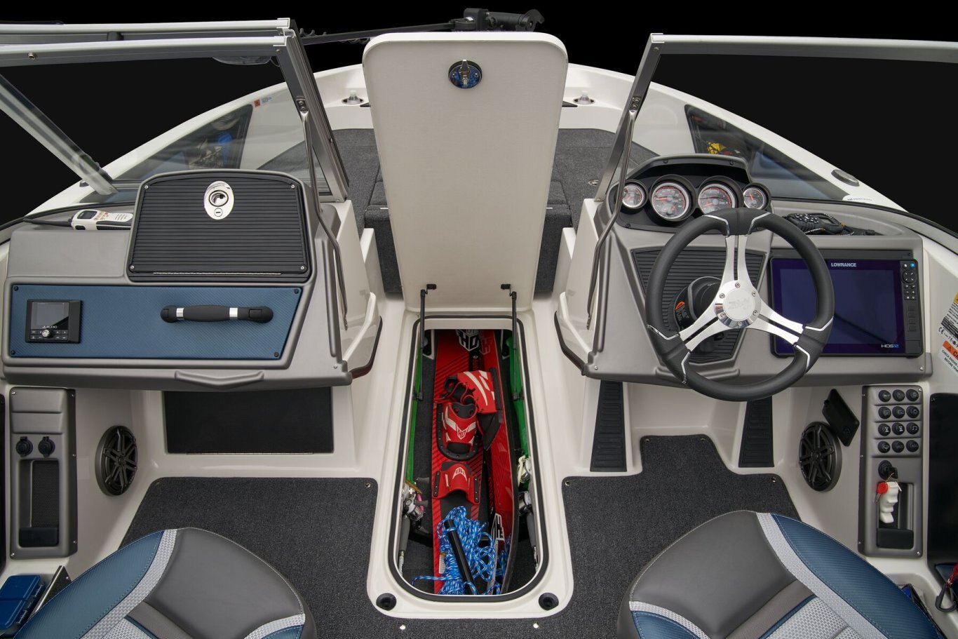 FISH OR SKI, THIS BOAT ALWAYS WINSMany crossovers leave families wanting more, but the Ranger® 2050MS boasts a smooth-riding hull, smart interior and legendary fishing heritage that stands head and shoulders above the competition. And new for 2025 is a redesigned bow panel that delivers more convenience and functionality. Ranger quality abounds from the foam-filled hull and upright, level flotation to the broad, stable beam that delivers peace of mind and unmatched safety. The wide-open cockpit features six custom-stitched seats, ski storage, a Bluetooth® stereo, USB charging ports, removable carpet, and an insulated cooler. When it’s time to buckle down and get after the fish, the patented folding front deck extension offers more casting room while a baitwell, Minn Kota® trolling motor, Lowrance® electronics and optional kicker provide superb fishability. Rounding out the package is stainless steel hardware, a full set of gauges, in-gunnel storage and interior LED lighting that make the 2050MS a class act no matter the day’s pursuit. Fish or ski, this boat always wins. |