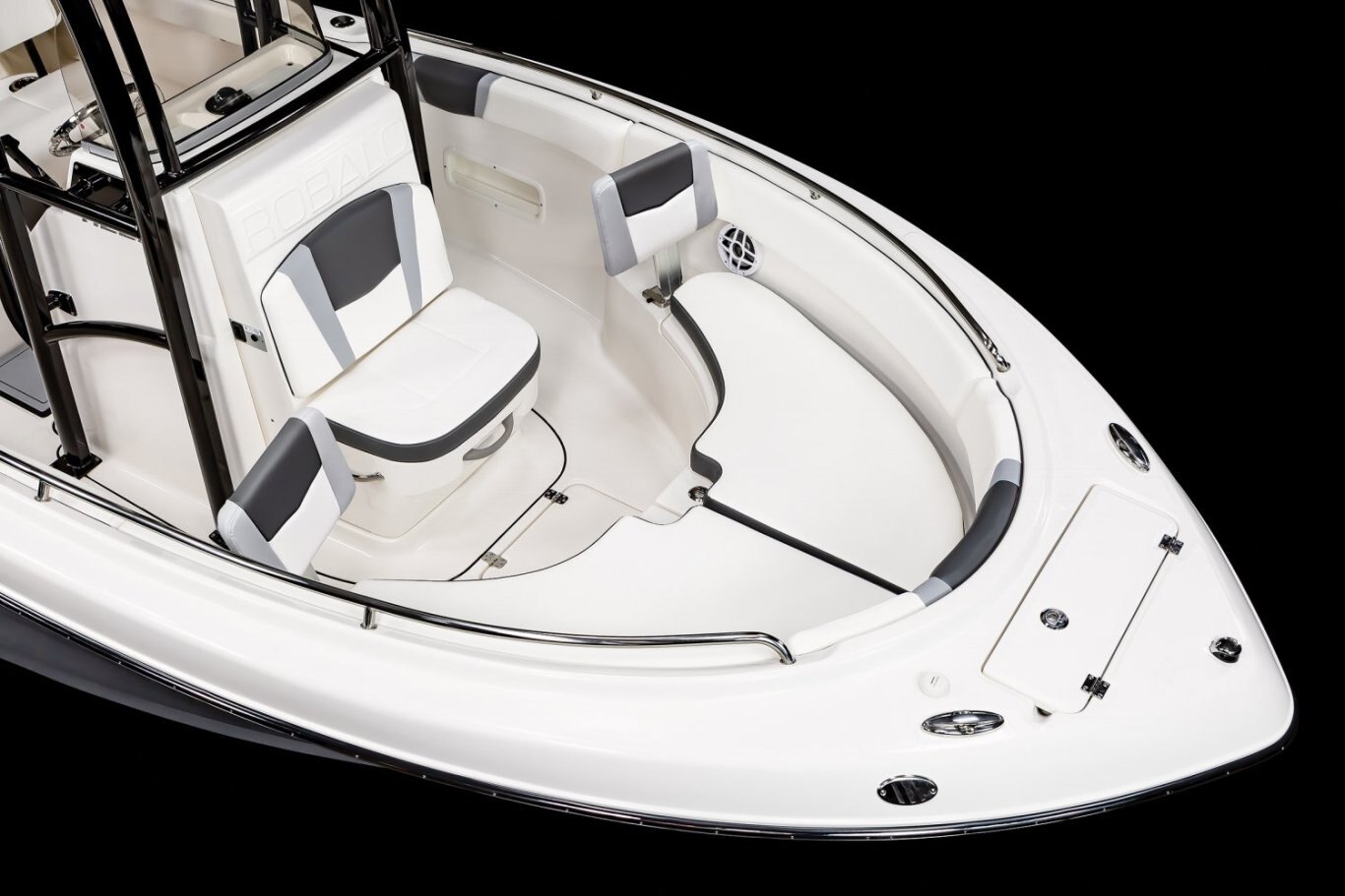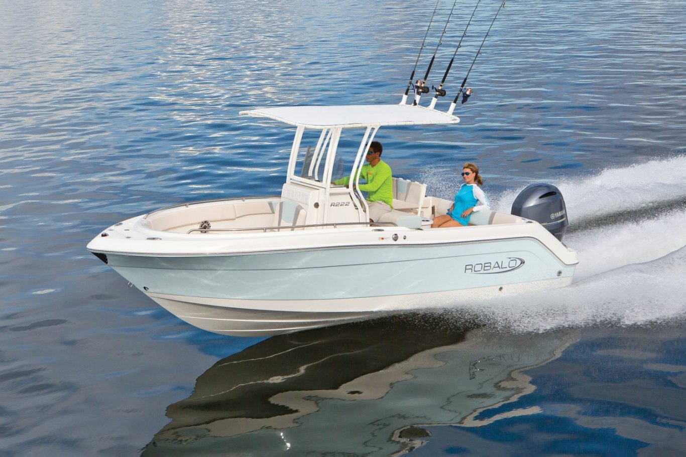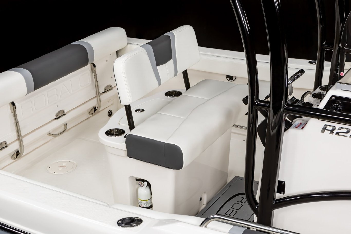 The Legacy ContinuesIt had to happen. Parlaying the game-changing success of the R180 and the R200, Robalo takes its center console offerings up a notch with the R222. The R222 is sold at a nationally advertised price. The keyword here is more. More centerline length. More storage space. More ride comfort. More seaworthiness. More fishing features. The only place where the new R222 proudly comes up short is its Reel Deal price tag. Key fishing features include twin 30-gallon fish boxes that can either keep your catch fresh or serve as storage areas. A 15-gallon livewell with LED lighting and a blue gelcoat finish is conveniently positioned under the standard leaning post. |