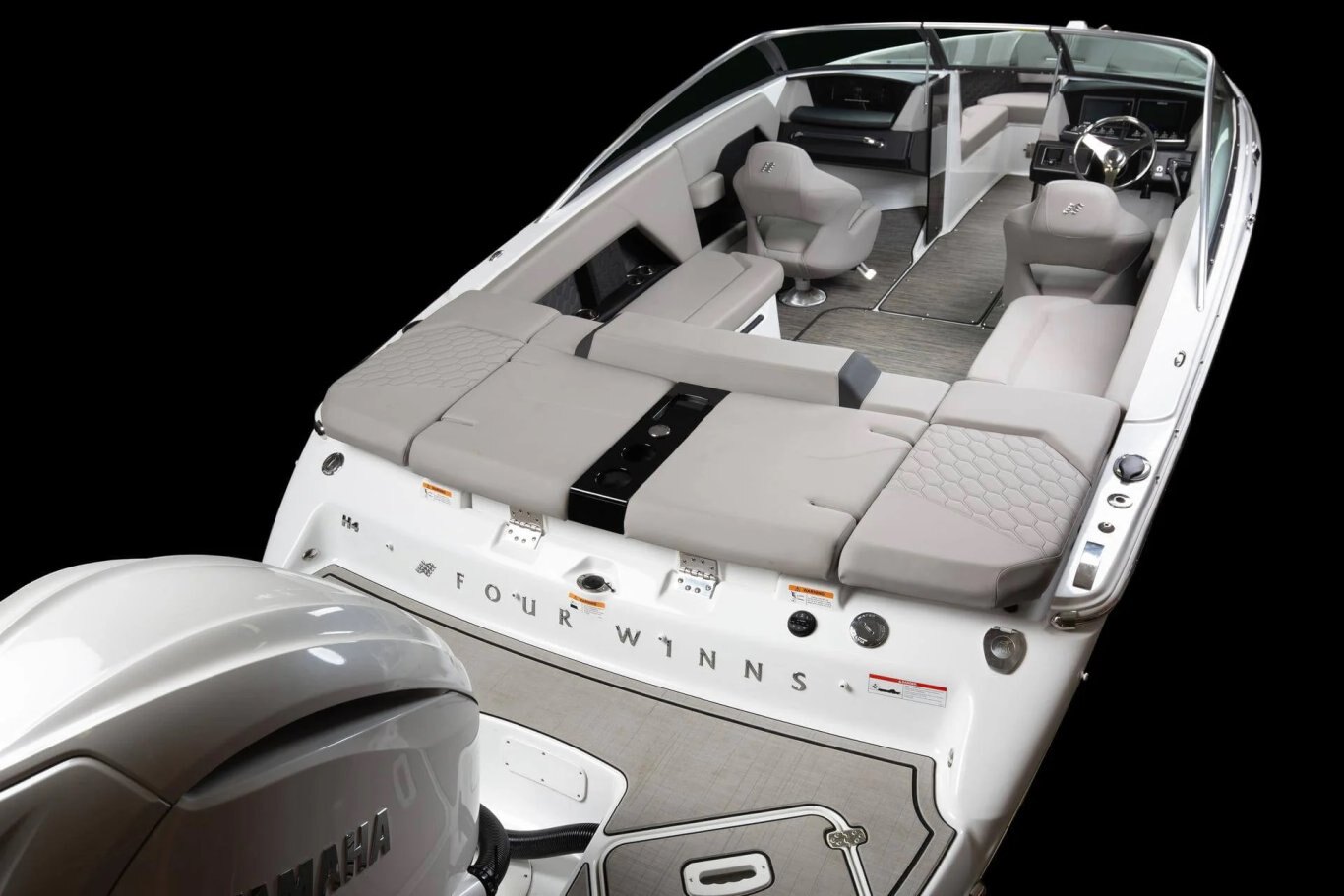 Every detail of the H4 has been meticulously designed to embody a premium aesthetic. From soft, grippy swim platform mats to woven cockpit flooring, these finishing touches exude refinement. True to Four Winns' legacy of superior craftsmanship, the H4 features intricate hand-sewn stitching, gleaming metal accents, and plush foam for unparalleled quality and comfort. Monochromatic color schemes introduce a fresh, streamlined look, while high-end materials like cool-touch vinyl-wrapped handles, durable upholstery, and padded bow walls blend durability with effortless style.