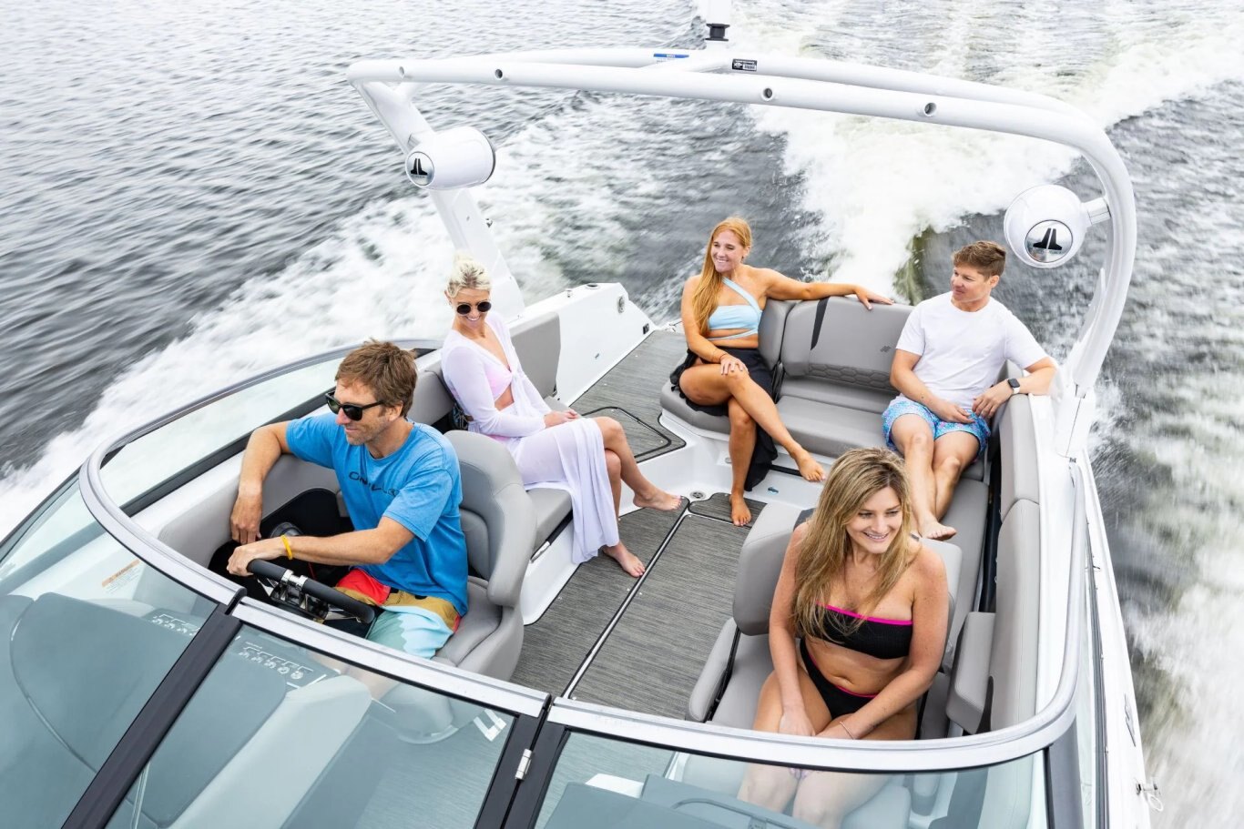 As the largest in the Surf lineup, the H6 Surf boasts refined interior styling, a generous beam, and deep seating that welcomes up to 14 onboard. Premium vinyls, ergonomic seating, and upscale finishes create an inviting space whether you’re prepping gear or kicking back post-session. An expansive swim platform and versatile aft lounge make transitions between surf and sun seamless, while thoughtful storage throughout keeps everything in place.