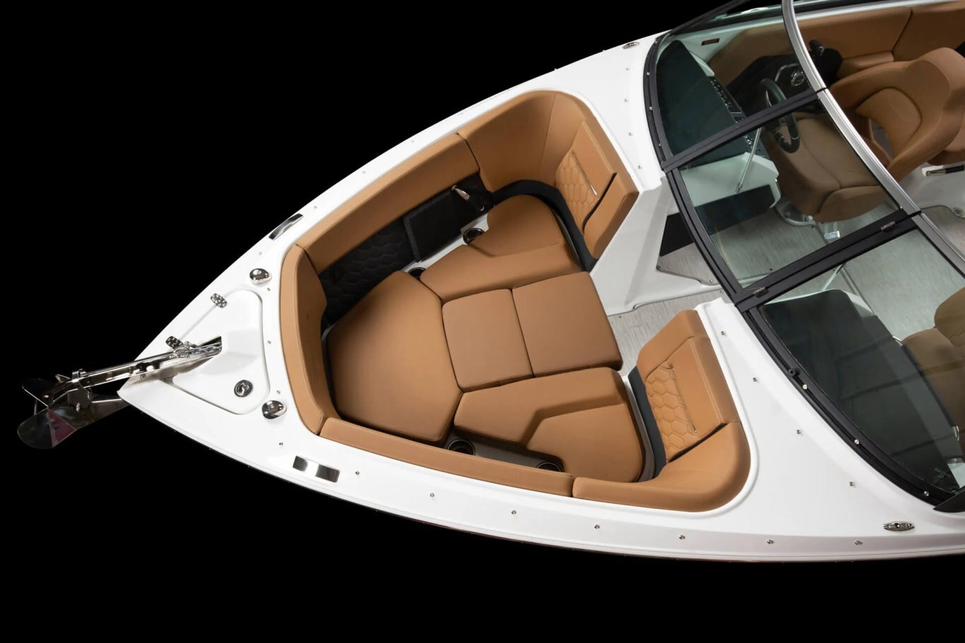 • Windshield w/walk-thru, full-height, curved glass, exclusive design