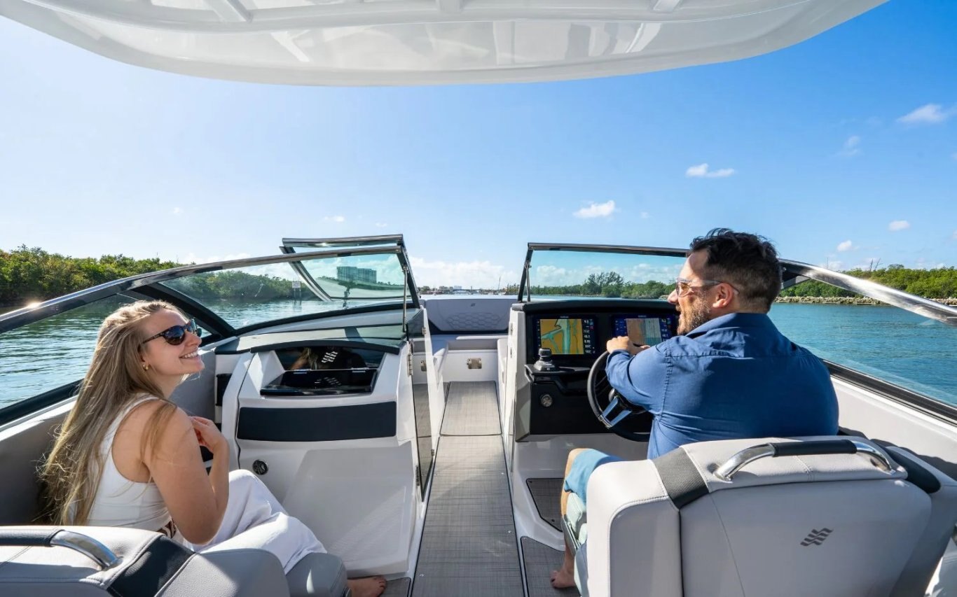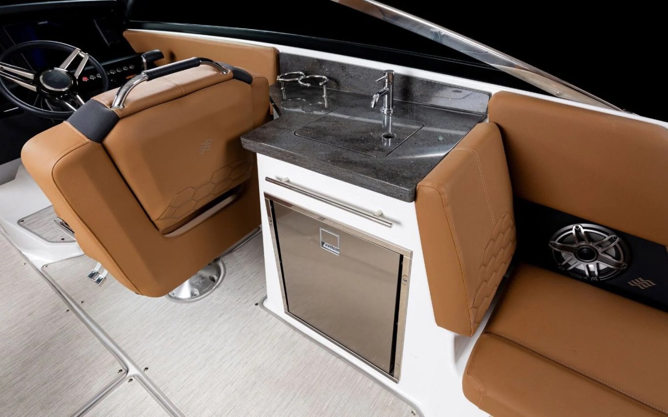 Immerse yourself in the sophistication of the H9 Outboard. This model features Elegant Side Terraces, a fold-down backrest for sunbathing, and various customizable features. With its sleek design, premium handsewn upholstery, and unparalleled comfort and style, the H9 OB is designed to impress. Navigate effortlessly with enhanced cockpit controls and enjoy the convenience of multiple storage compartments and a built-in galley. Elevate your boating experience with the H9 OB.