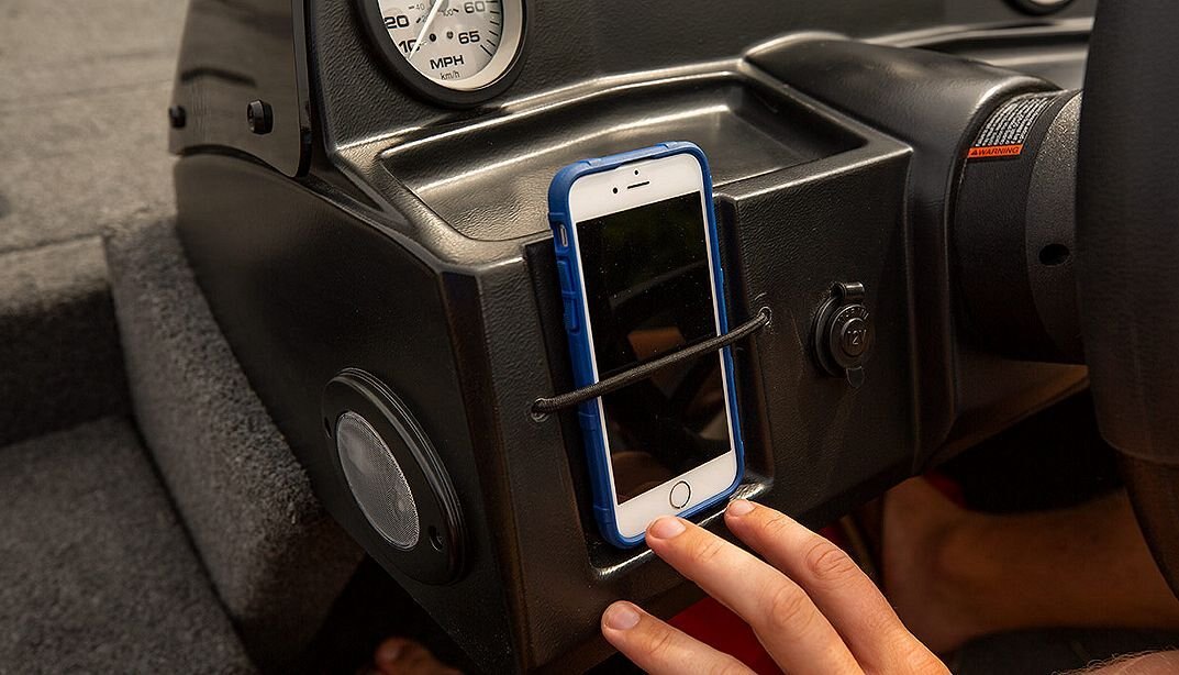 The cockpit of a Lowe Skorpion 17 has a stylish and clutter-free console featuring gauges with outstanding low-light readability and scratch resistant domed lenses, tinted windshield, phone holder and USB port.