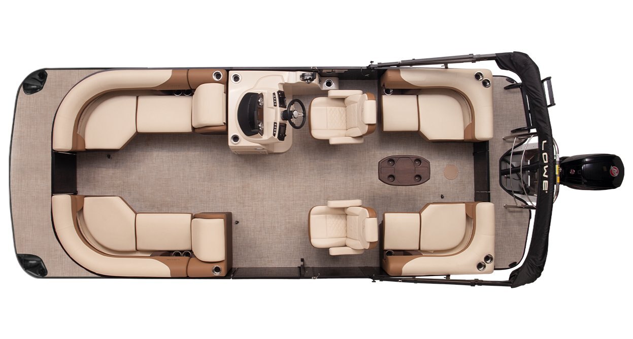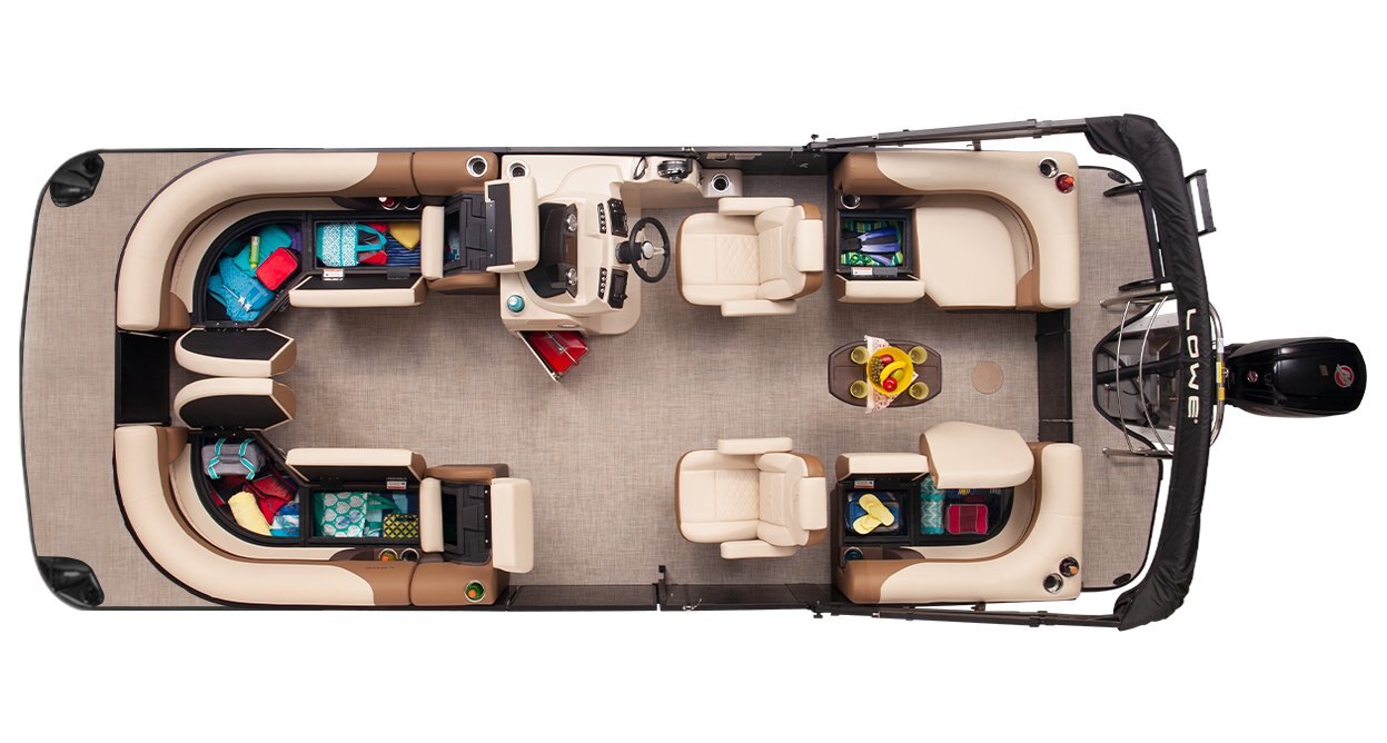 The SS pontoon features a stylish fence with optional two-tone graphics. The interior has premium fabrics with 4 complimentary vinyl colors and a debossed quilted pattern in the storage alcoves. Capped off by comfortable helm chairs for the captain and first mate.