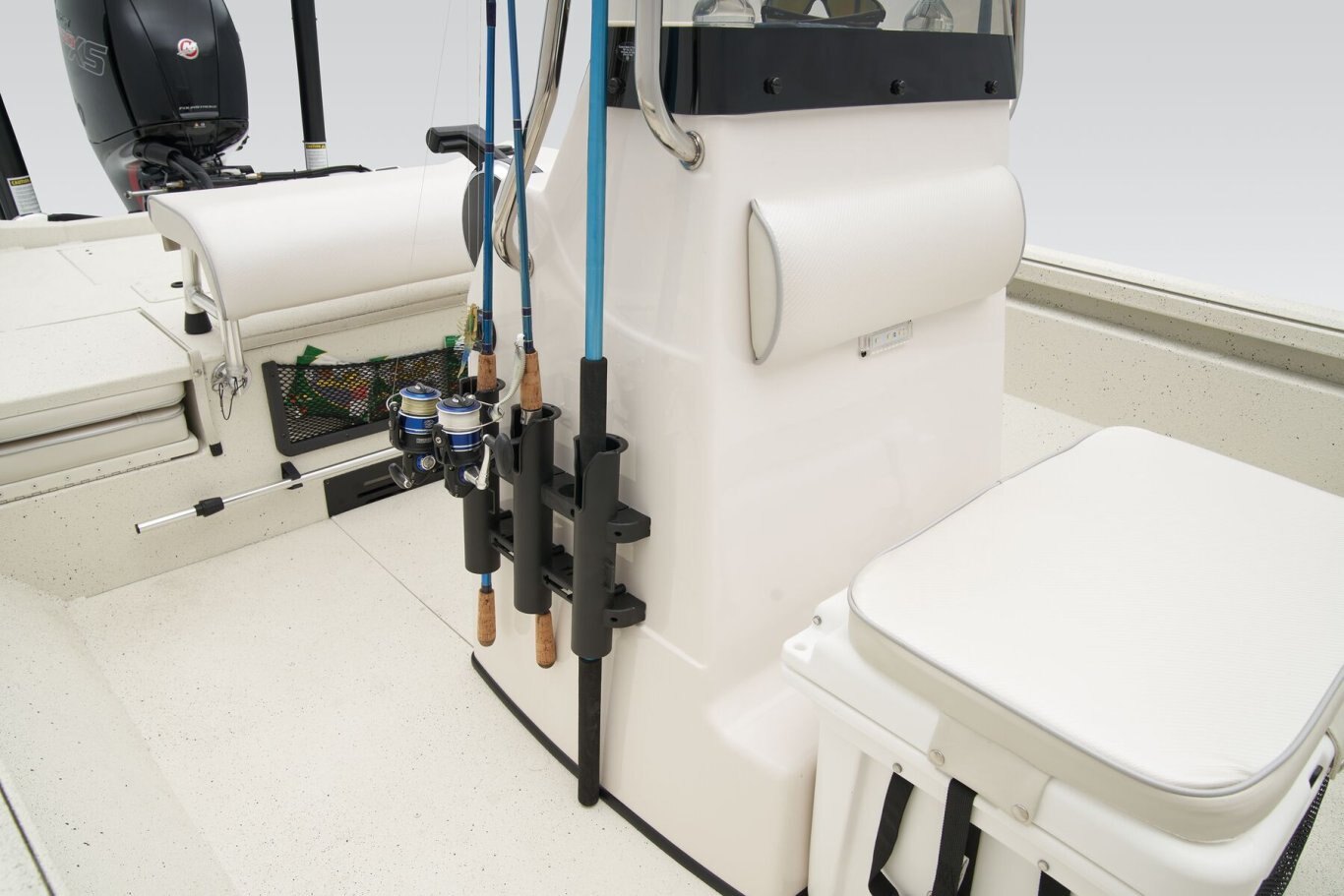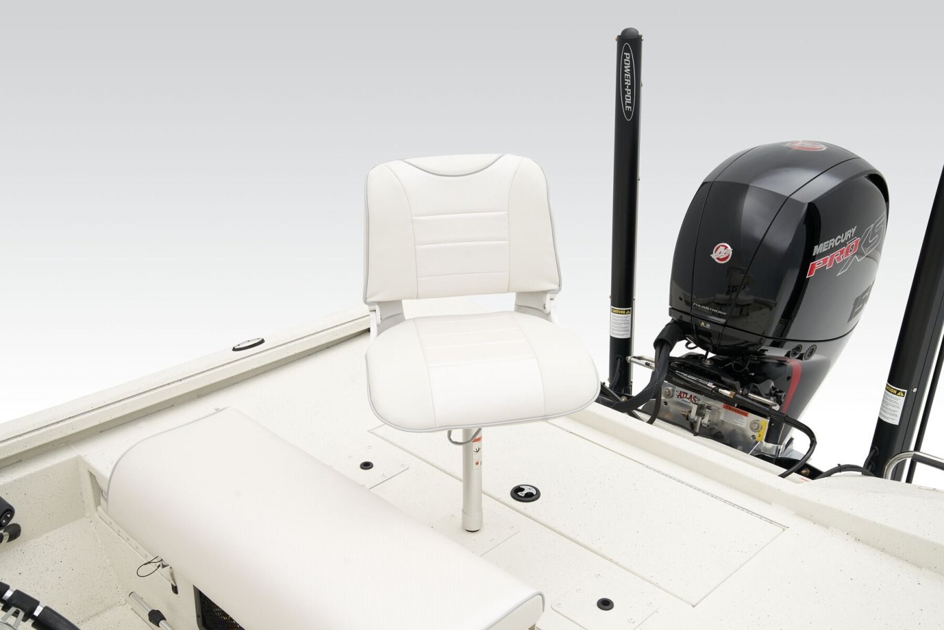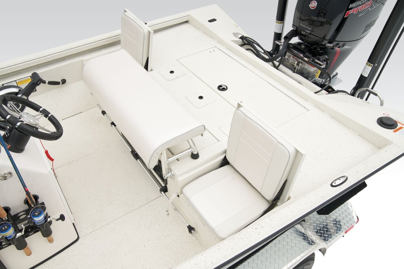 • Custom fitted marine upholstery: aluminum leaning post, (1) fold down, (1) bike, dual jump Seats