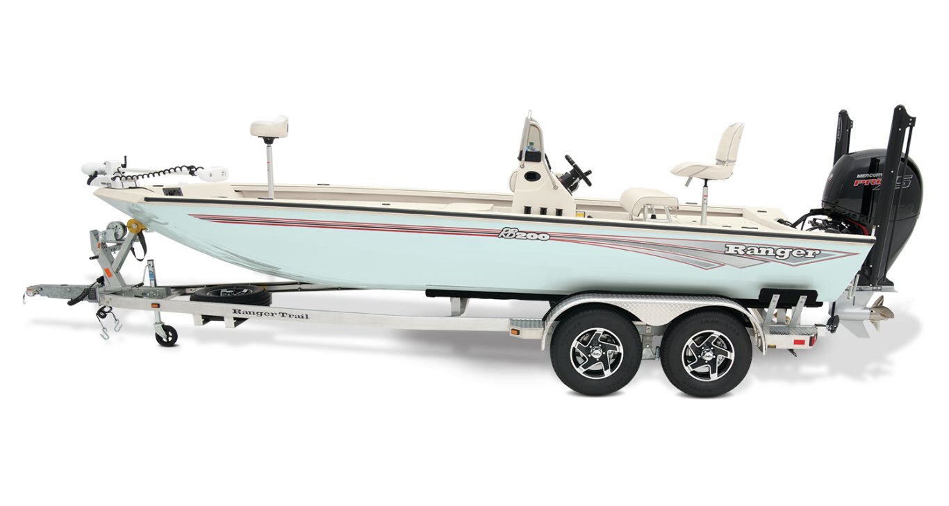 At the helm, electronics up to 9" may be flush mounted and the Ranger RIDE™ touchscreen display keeps critical engine parameters and boat functions at your fingertips. The ruggedized Ranger Trail® trailer is constructed with all-welded aluminum for the utmost in corrosion-resistant strength and diamond plate fenders offer a step up and protection from road debris. New paint schemes set this rig apart even more with premium paints that deliver long-lasting shine and durability in salty environments. No matter where your quarry swims, the enhanced capability of the RB200 is designed to Dominate Inshore and Nearshore.