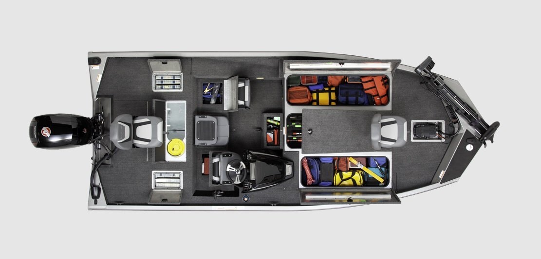 Huge 45.8 sq. ft. self draining bow deck with sealed storage and recessed trolling motor pedal.